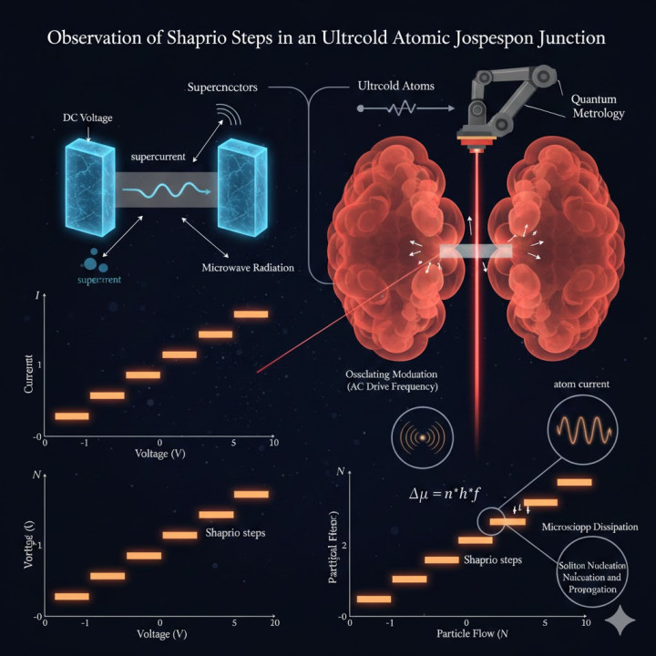 夏皮罗台阶(Shapiro steps)是约瑟夫森效应的一个标志性特征,最初在受微波驱动的超导约瑟夫森结中被发现。这一现象具有深刻的量子力学起源,并构成了现代电压标准的基础。发表在《科学》的论文《Observation of Shapiro steps in an ultracold atomic Josephson junction》(在超冷原子约瑟夫森结中夏皮罗台阶的观测)标志着一个重大的里程碑:首次在超冷原子气体制成的约瑟夫森结中,成功观测到了这一量化现象。这项工作不仅证明了约瑟夫森效应在原子系统中的普适性,更重要的是,它提供了一个前所未有的、可直接观测的平台,以研究传统超导系统中难以触及的微观耗散动力学,特别是声子和孤子的成核与传播。
